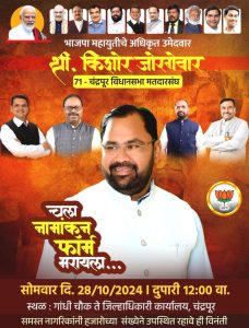भाजप प्रदेशाध्यक्ष चंद्रशेखर बावनकुळे यांच्या उपस्थितीत उद्या आमदार किशोर जोरगेवार दाखल करणार नामांकन अर्ज..!!